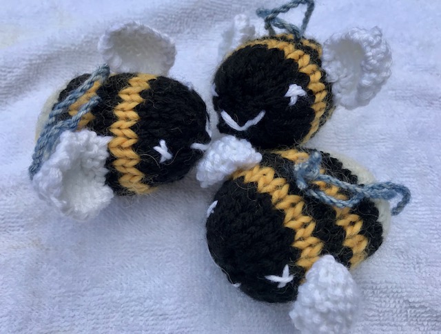Cute bumble bees with 2 yellow stripes and a white bottom just like the ones in my garden. They have a cord so you can hang them from a car mirror, school bag etc. They are 7 cm long, stuffed with organic fleece and cost €7