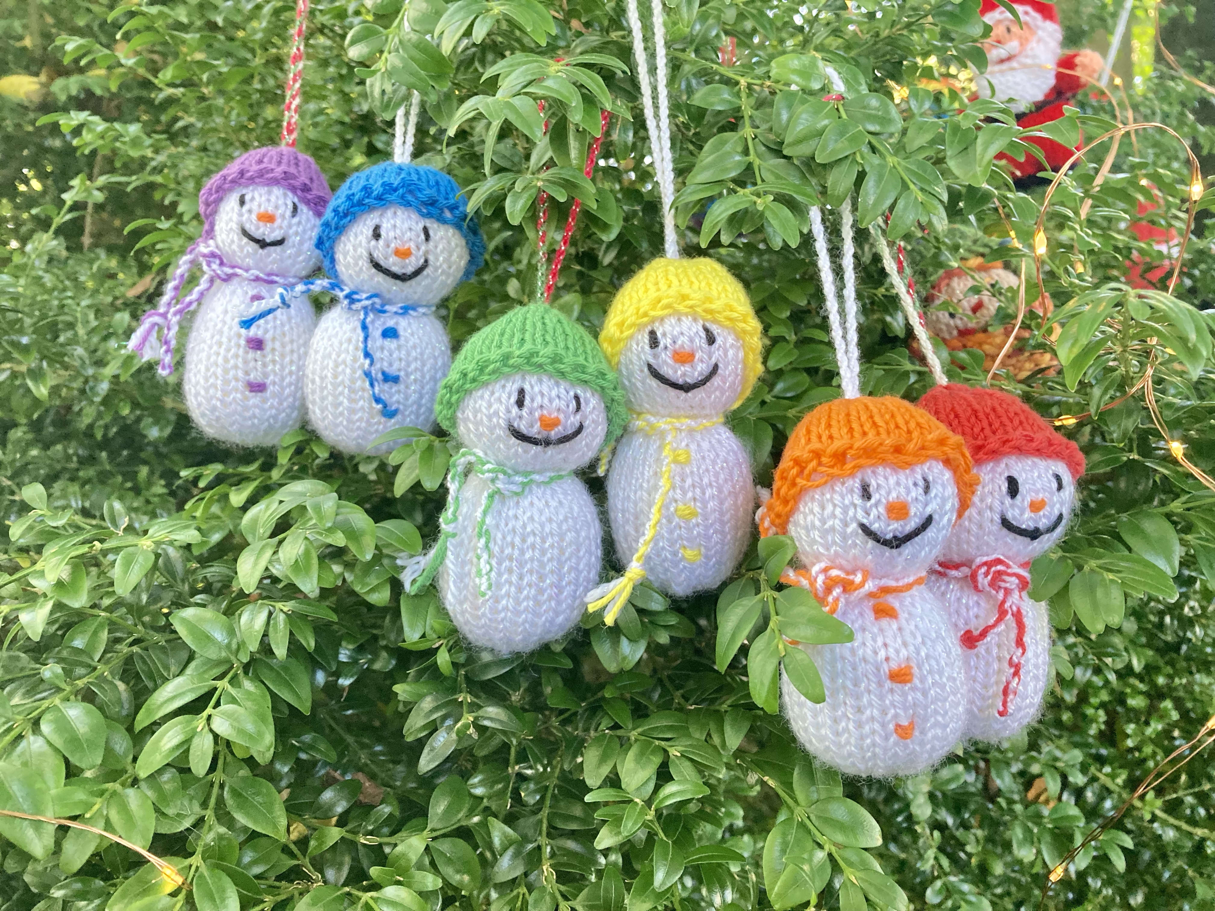 Rainbow coloured snowmen ready to cheer up your Christmas tree. Knit with glittery white wool and wearing a hat and matching scarf in cotton. They can be personalised with an initial on their hat. 9cm tall, stuffed with organic fleece €7 each