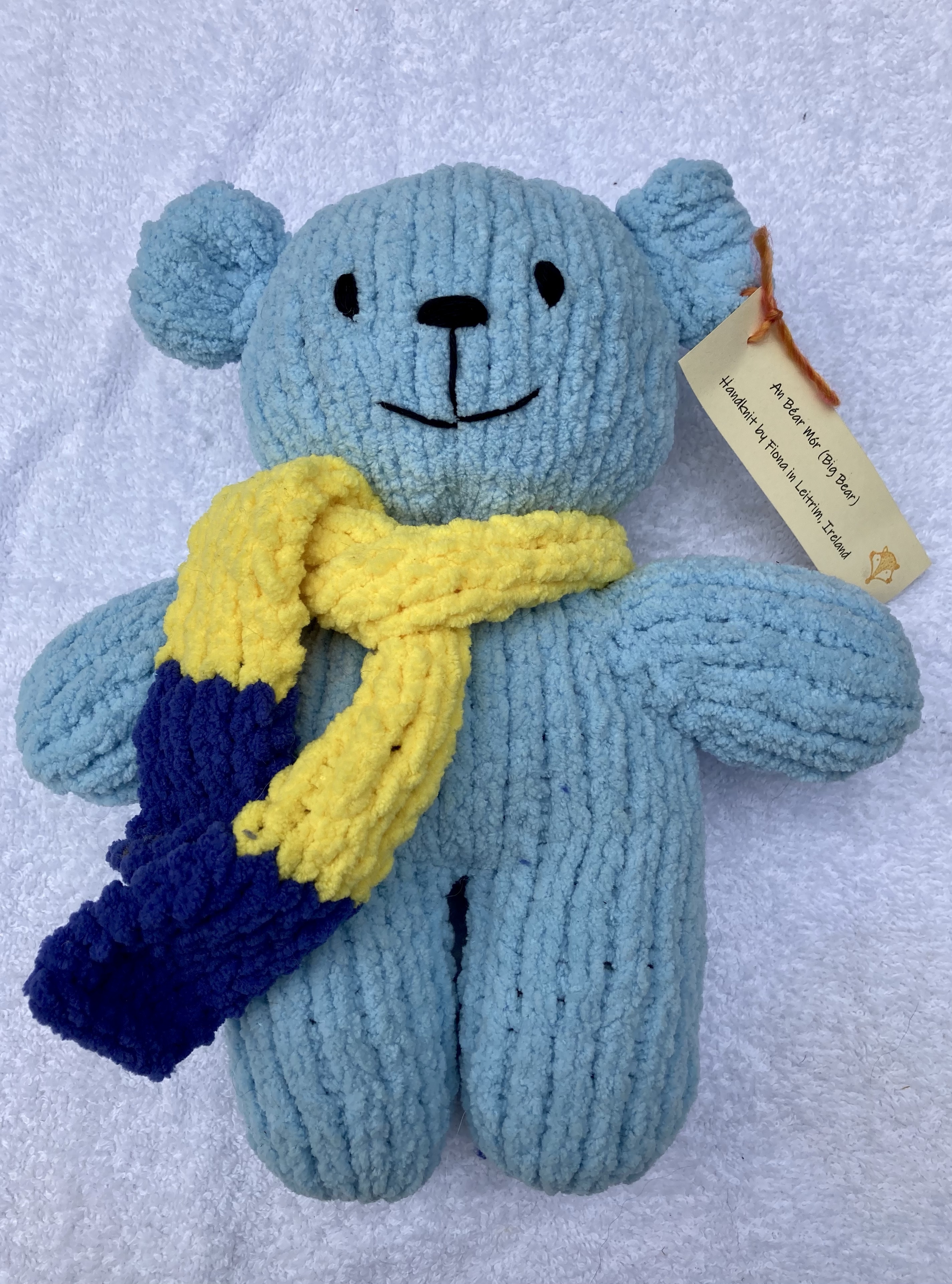 A traditional hand knit teddy, the perfect size for a child to hold. They come in many colours, each one with an individual twist. They are 25cm tall and stuffed with pure organically reared lamb fleece. Contact me to see photos of which Béiríns are currently available. €30 each, personalised for €32 ( name sewn on etc)