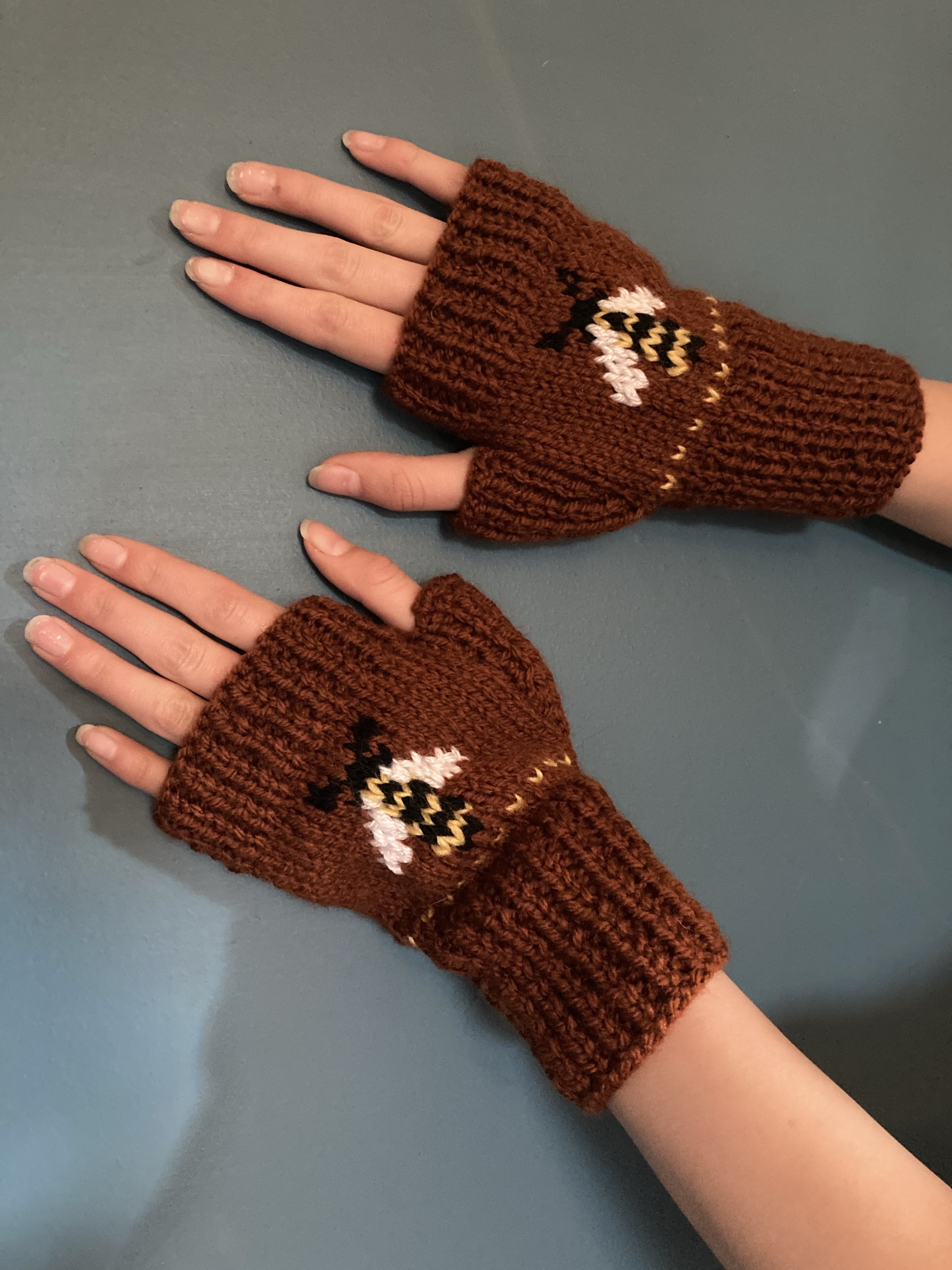 A range of fingerless gloves that keep you warm while leaving your fingers free to use your phone or write a letter. Available with a variety of motifs such as dogs, paw prints ,acorns, bees, love hearts, birds, cats and whales and in a wide range of colours.